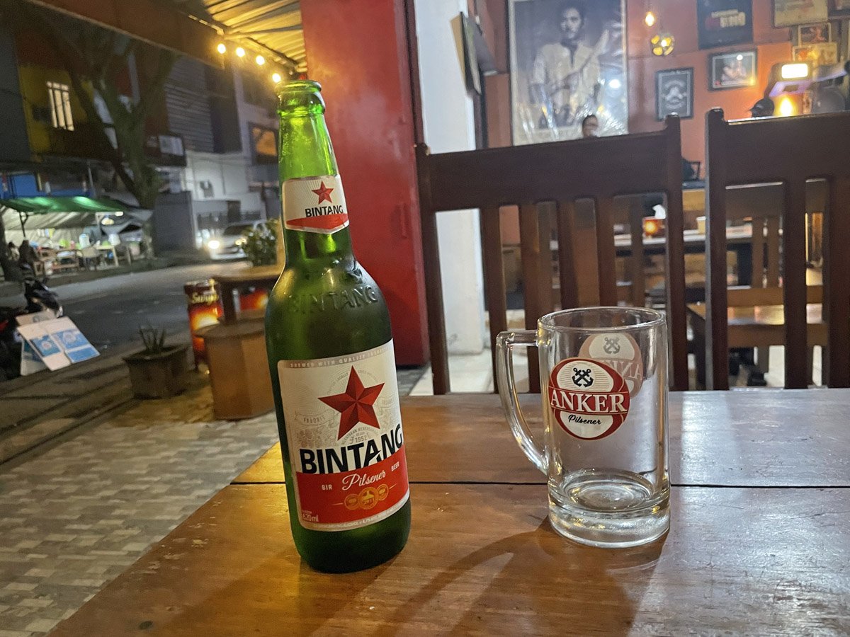 The ferry to Saparua leaves early in the morning, so once again, we didn't have time for nightlife. I had my first and only beer in Indonesia—a giant 620 ml bottle of lukewarm Bintang beer. The bar had live music, but the songs were mostly international classics. It was almost empty, except for a retired Dutchman, originally from Germany, who had just married a much younger woman from Ambon. He approached me and bluntly asked, “Ben je Nederlander?” He guessed correctly. I tried to finish my warm beer and wished I had ordered fresh fruit juice instead. As we left, we high-fived the singer.