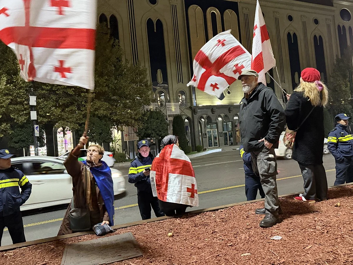 I was really in a hurry to join the daily protests. I dropped my bag, unwisely skipped dinner, and walked toward Rustaveli Avenue. People were already gathering, waving Georgian, Ukrainian, US, and EU flags. A few dozen police officers were blocking Rustaveli Avenue. The night before, protesters had wandered onto the avenue and blocked traffic.