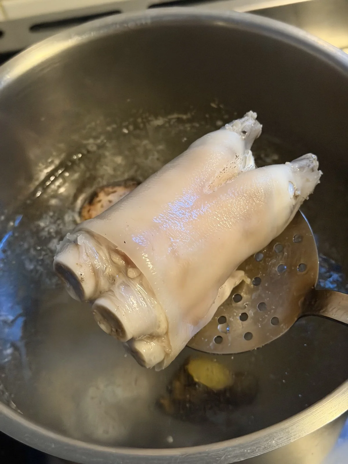 Pork stock for Vietnamese noodle soups. I used three pieces of pig's trotters, charred onions, charred ginger and salt.